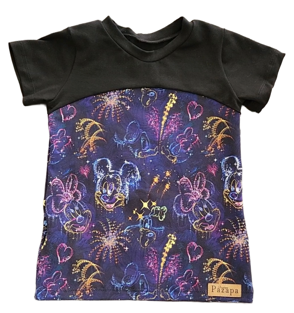 Haut du chandail (avant et arrière) en noir. Bas du chandail (avant et arrière) avec le motif Magie animée. Tissu ultra confortable et élastique.