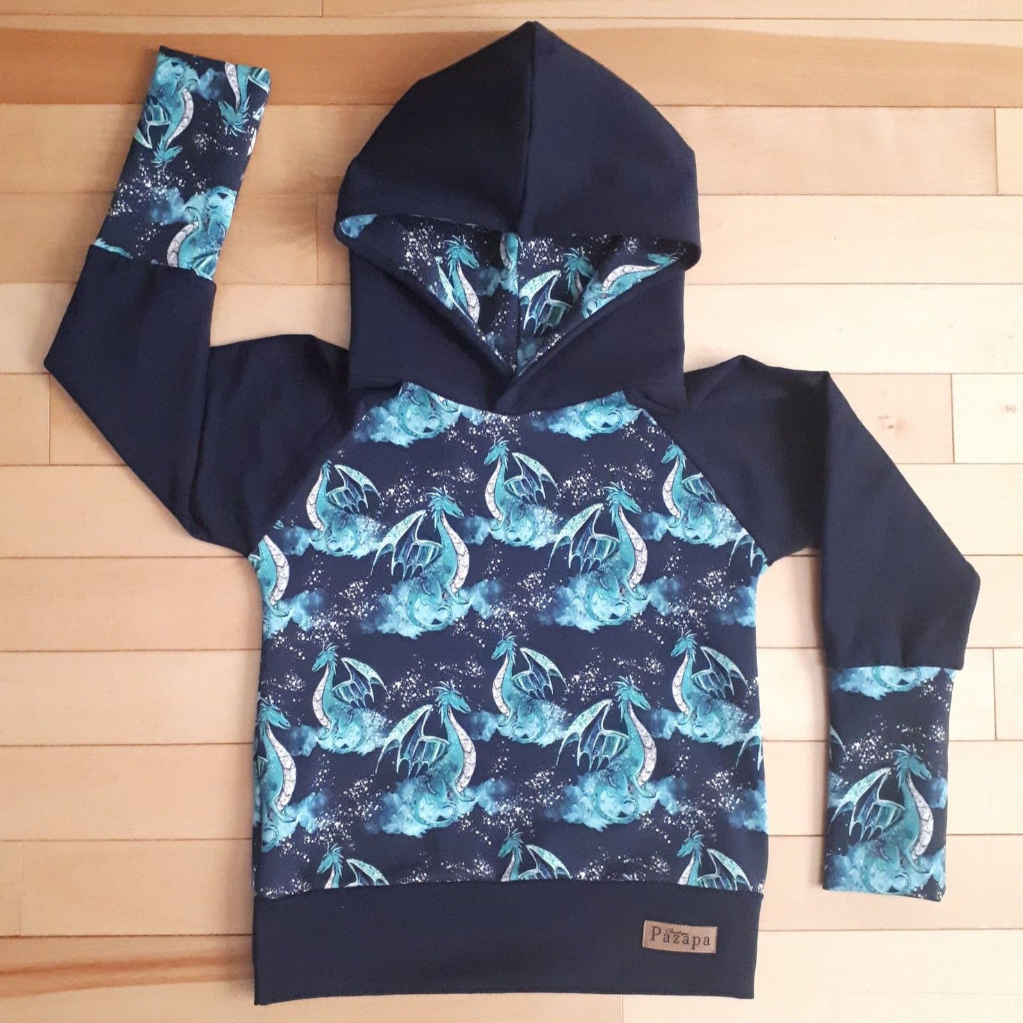 Devant, derrière du chandail et intérieur du capuchon avec le motif dragons. Bande de taille, bras et extérieur du capuchon en bleu marine. Bandes extensibles avec le motif dragons qui se déroulent aux poignets pour grandir avec l'enfant. Tissu ultra confortable et élastique. Parfait pour toutes les saisons.