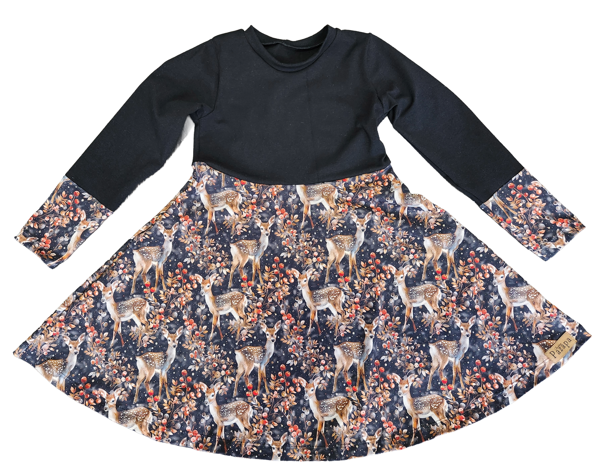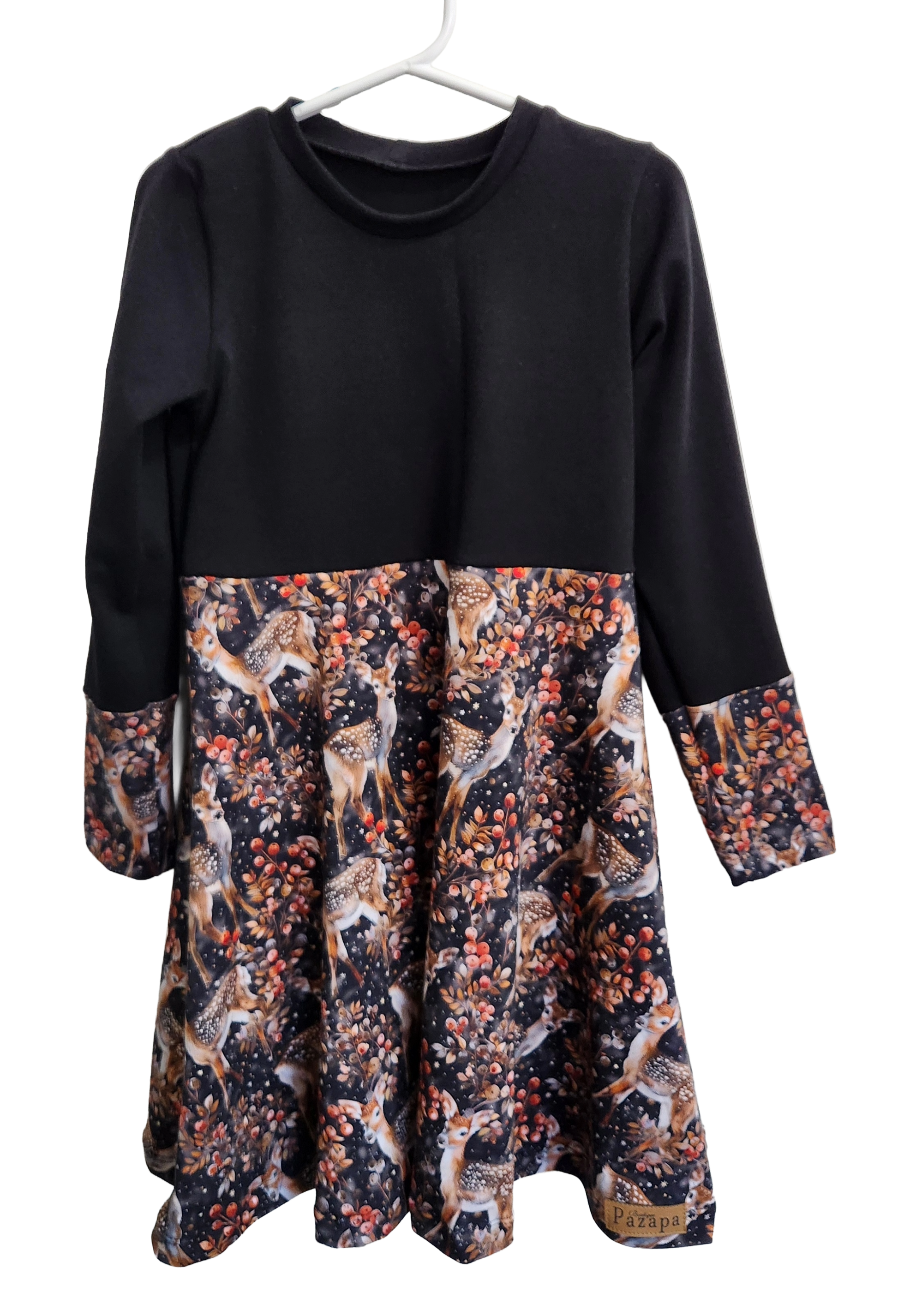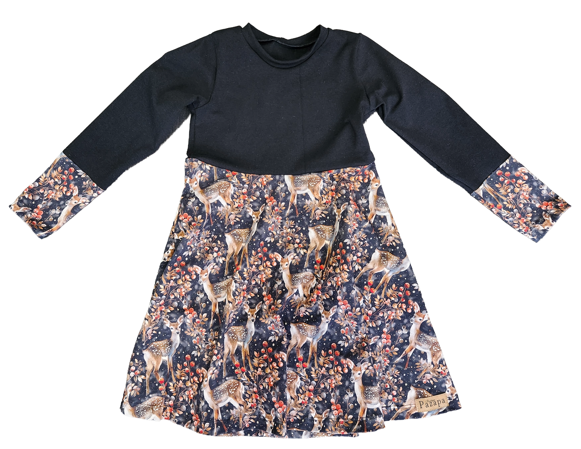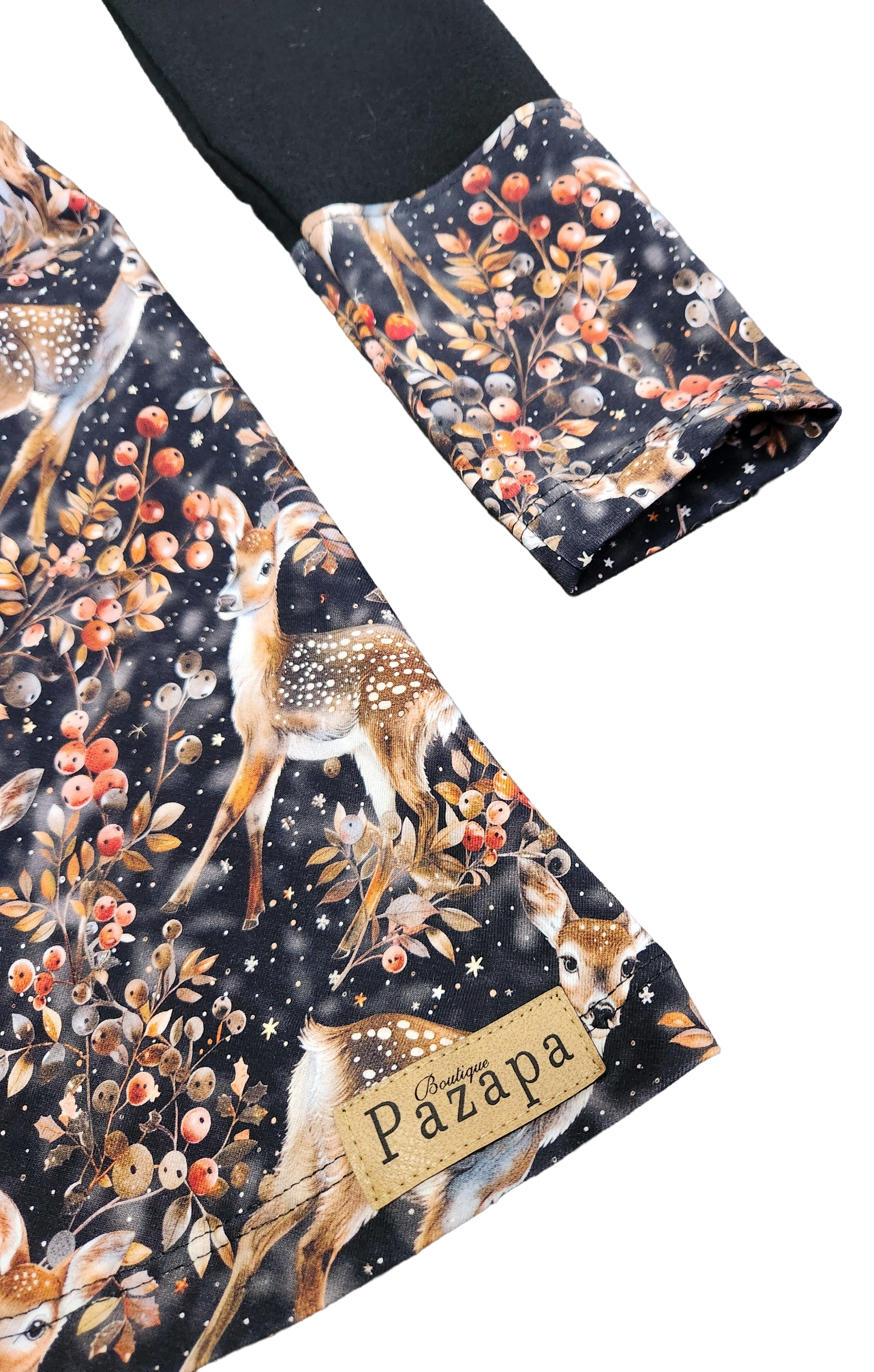 Haut de la robe en noir avec bout de manches avec le motif chevreuil. Bas de la robe avec le motif chevreuil.